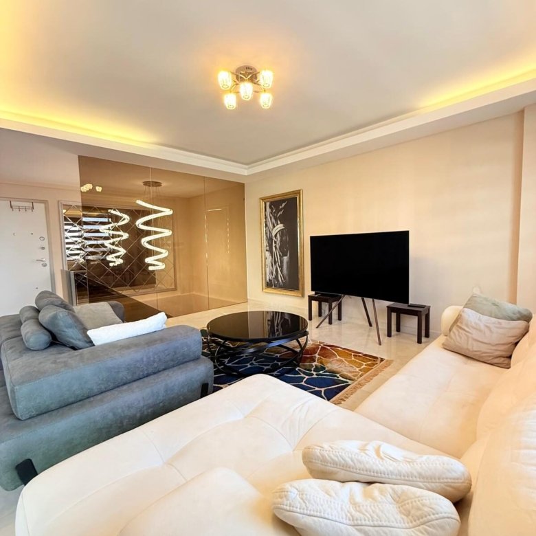 The apartment features a spacious living area of 120 m², is situated on the 1st and 2nd floors, and is south-facing, providing abundant natural light throughout the day. The property is offered fully furnished and includes 2 bathrooms and 2 WCs, ensuring maximum comfort for family living.