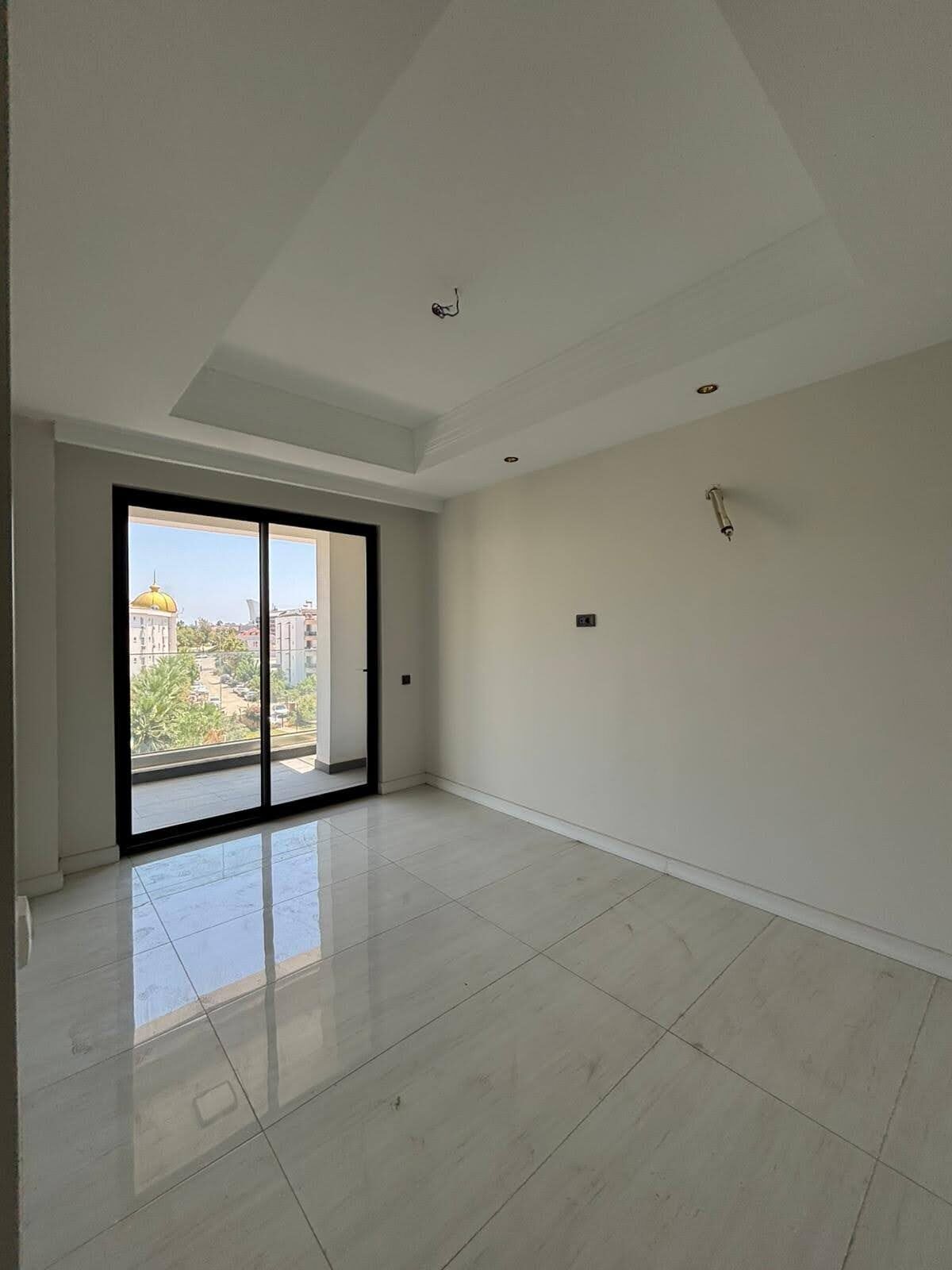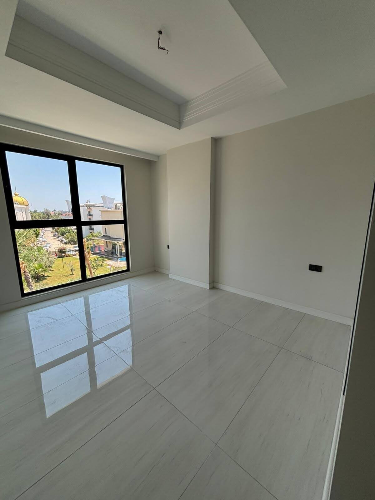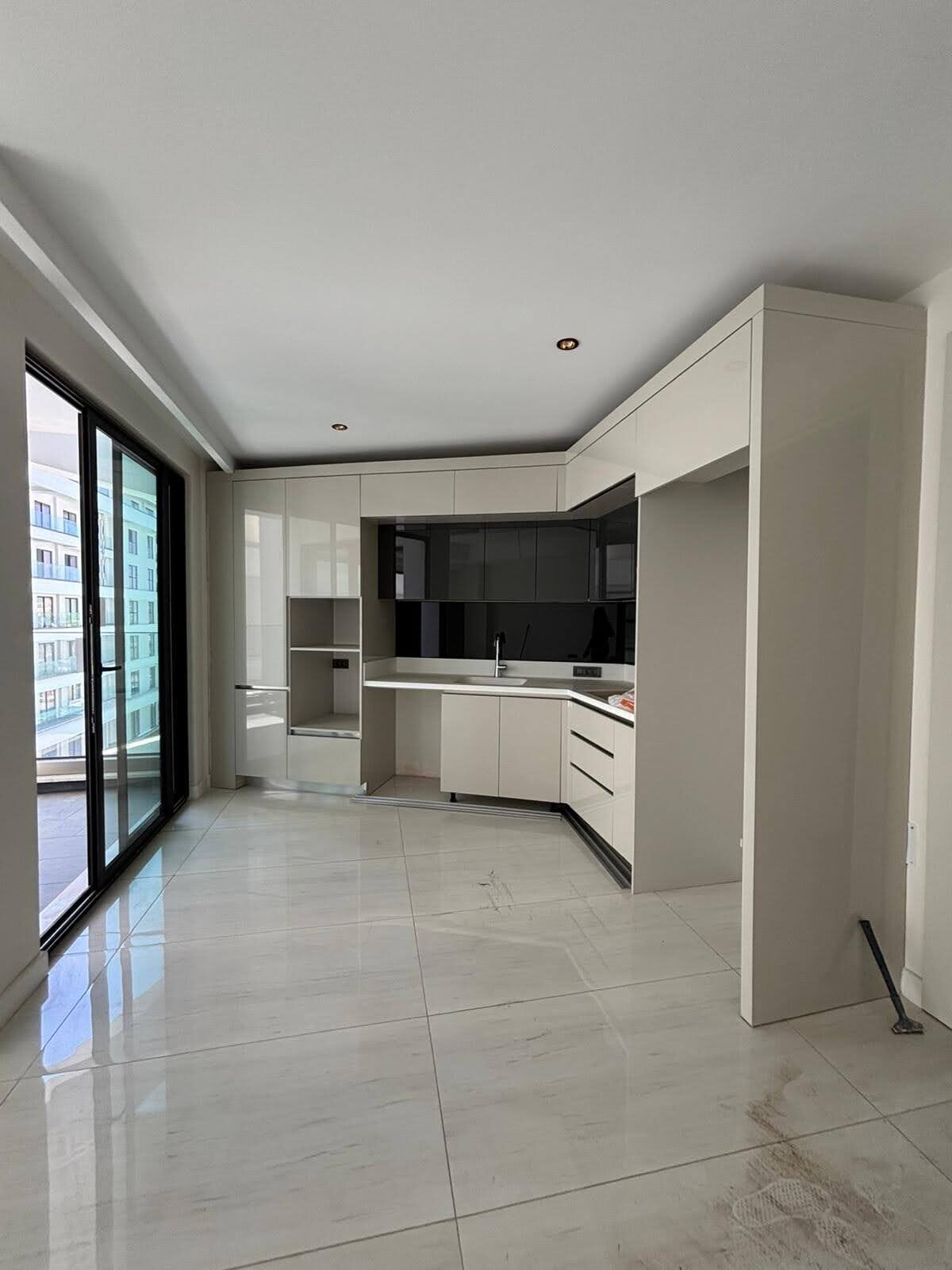 The apartment is delivered with a fitted kitchen, high-quality sanitary ware, and premium porcelain tile flooring throughout. East-facing windows provide pleasant natural light and overlook a neighboring hotel, offering an urban yet refined view.