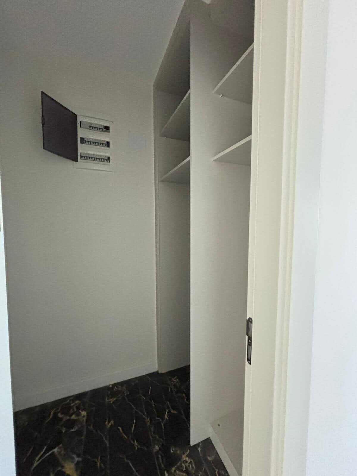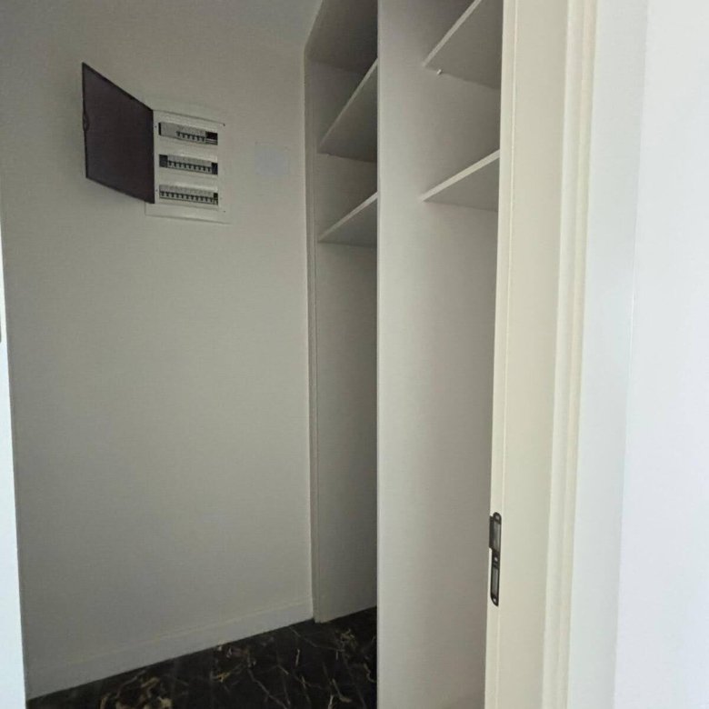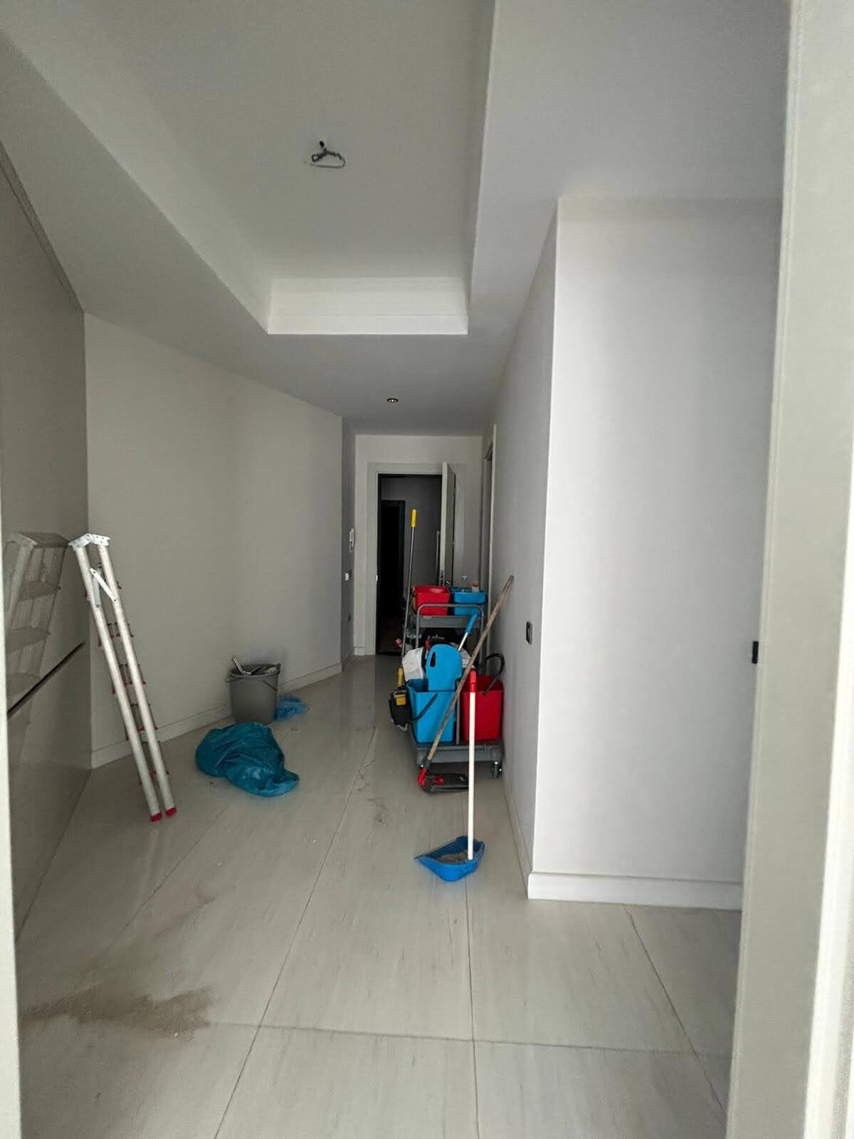 The apartment is delivered with a fitted kitchen, high-quality sanitary ware, and premium porcelain tile flooring throughout. East-facing windows provide pleasant natural light and overlook a neighboring hotel, offering an urban yet refined view.